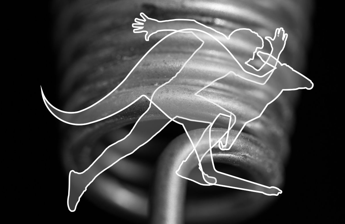 Die Faszien spielen auch eine wichtige Rolle in der Kraftentwicklung. Faszien erzeugen durch Dehnspannung Kraft und leiten diese im Körper weiter. Wir erinnern uns, auch Sehnen gehören zu den Faszien. Wird die Achillessehne beim Laufen gedehnt, gibt sie wie ein Gummiband die Energie an den Muskel zurück, wenn sich dieser zusammenzieht und unterstützt dabei die Muskelkraft. Das geschieht nicht ausschließlich in der Achillessehne, sondern im ganzen faszialen Apparat, womit eine Kraftspirale entsteht.